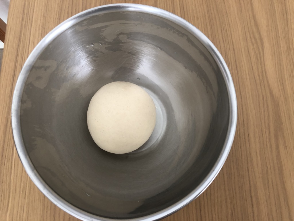 両手で生地の向こう側を手前に少しおりたたむようにして、向こうに押し出すという動作を繰り返してこねる。