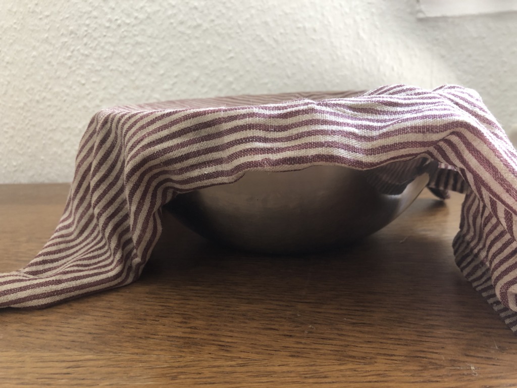 ⑥ 濡れ布巾をかぶせて、暖かい場所に置いて、一次発酵させる。生地が 2 倍くらいになるまで。