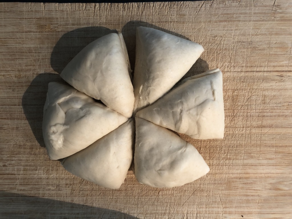 もう一度まるめなおして、包丁などで、放射線状に 6 等分にカットする。